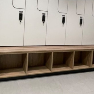 Natural Timber or Compact laminate Slats, on an integrated MR MDF laminate open shelf storage units.
